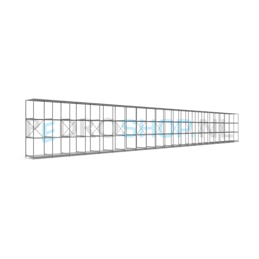 Metalen stellingkast: 300cm (h) x 100cm (d) x 2216.8cm (l)