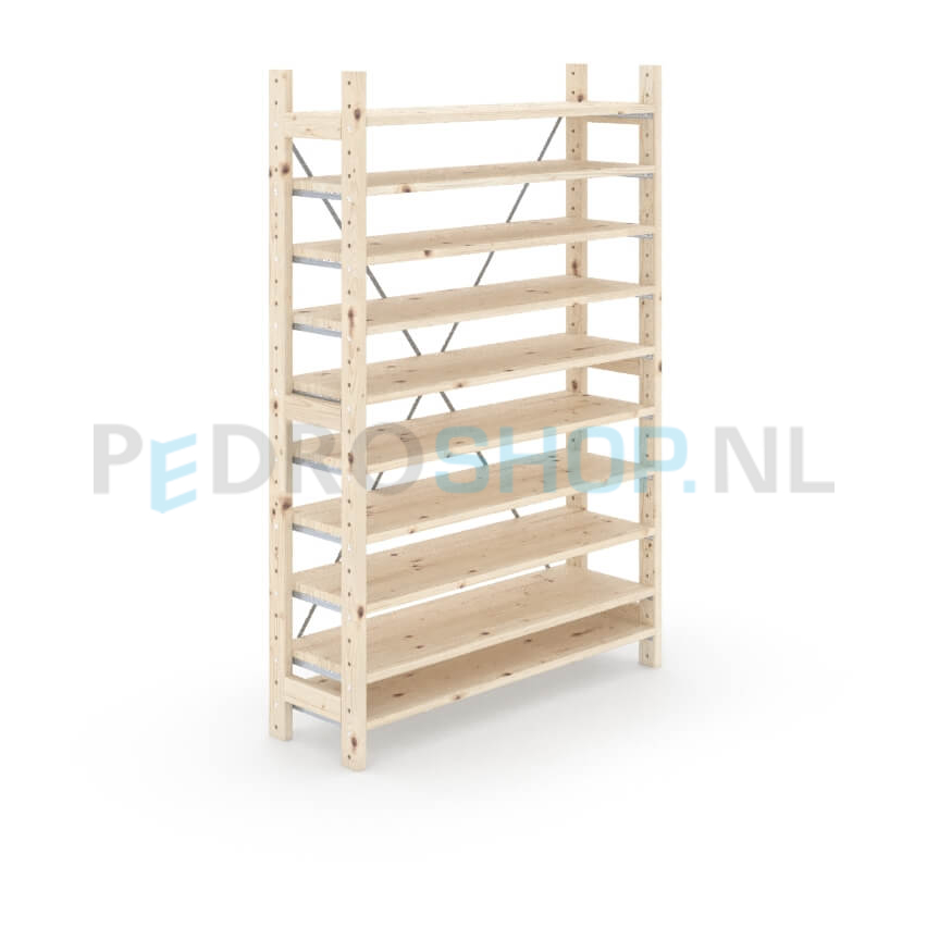 Eigen label houten stellingkast, dus goedkoop, flexibel en snel leverbaar! De onderdelen van de houten stellingen van ons eigen label zijn gemaakt van eersteklas Oost-Europees vurenhout en garanderen daarom jarenlang gebruiksgemak. Met de houten legbordstellingen en houten rekken kunt u uw magazijn eindeloos aanpassen, herinrichten en uitbreiden. U kiest voor betaalbare houten rekken, flexibiliteit met een goede kwaliteit! De houten stellingkast kunt u via onze handige configurator in een aantal stappen online samenstellen. Online uw houten stellingkast bestellen is nog nooit zo makkelijk geweest. Heeft u een groot archief in te richten met houten stellingen? Wij maken graag een passende offerte. Houten stelling kopen? Dan bent u bij ons aan het juiste adres.